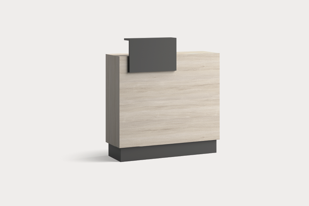 Mueble de recepción de colores neutros y líneas rectas, parte de los salones NEON y URBAN. Estructura interna de DM de alta presión.